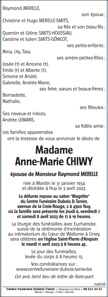 Died in Huy (4500) on 03 April 2023 at the age of 89 years