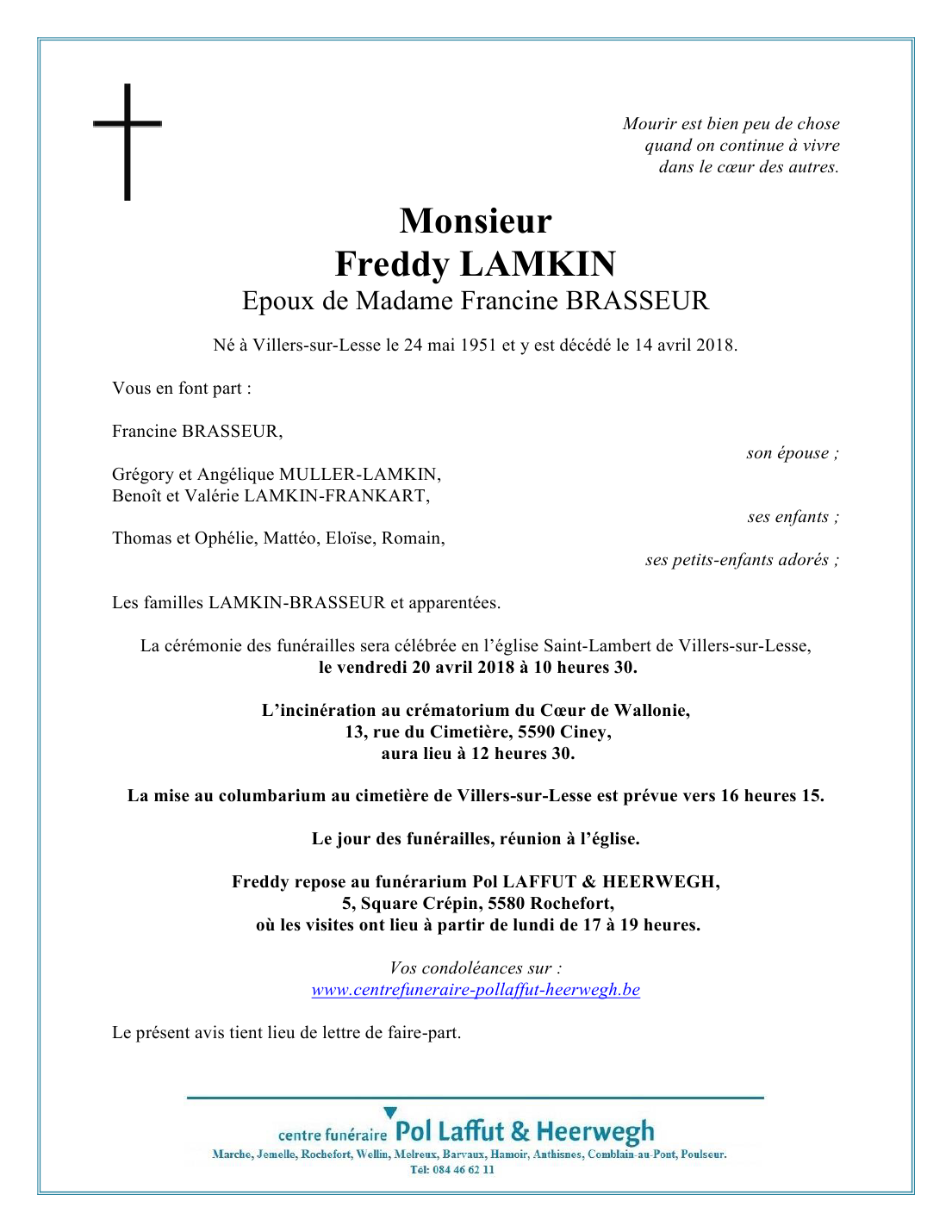 Died in Villers-sur-Lesse (5580) on 14 April 2018 at the age of 66 years