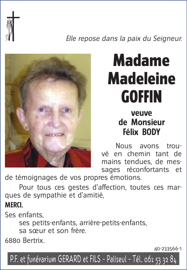 Décédée à Bertrix (6880) le mercredi 13 janvier 2016 à l'âge de 88 ans