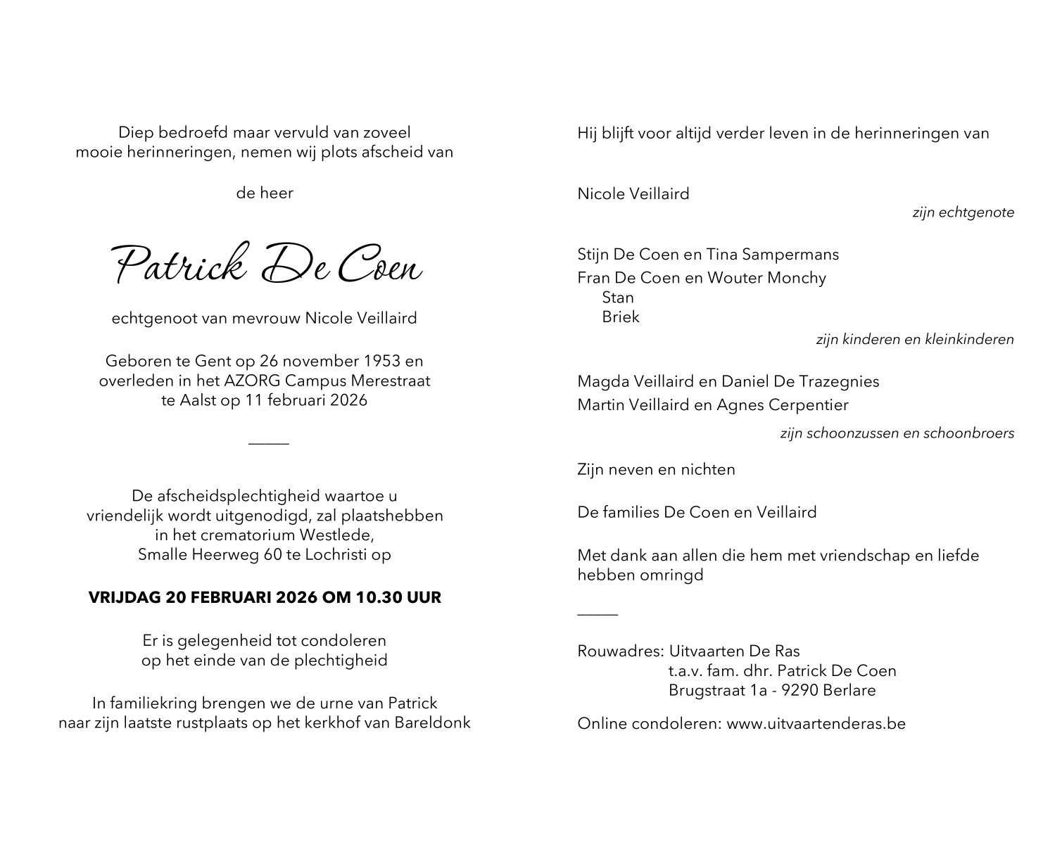 Décédé à Aalst (9300) le mercredi 11 février 2026 à l'âge de 72 ans
