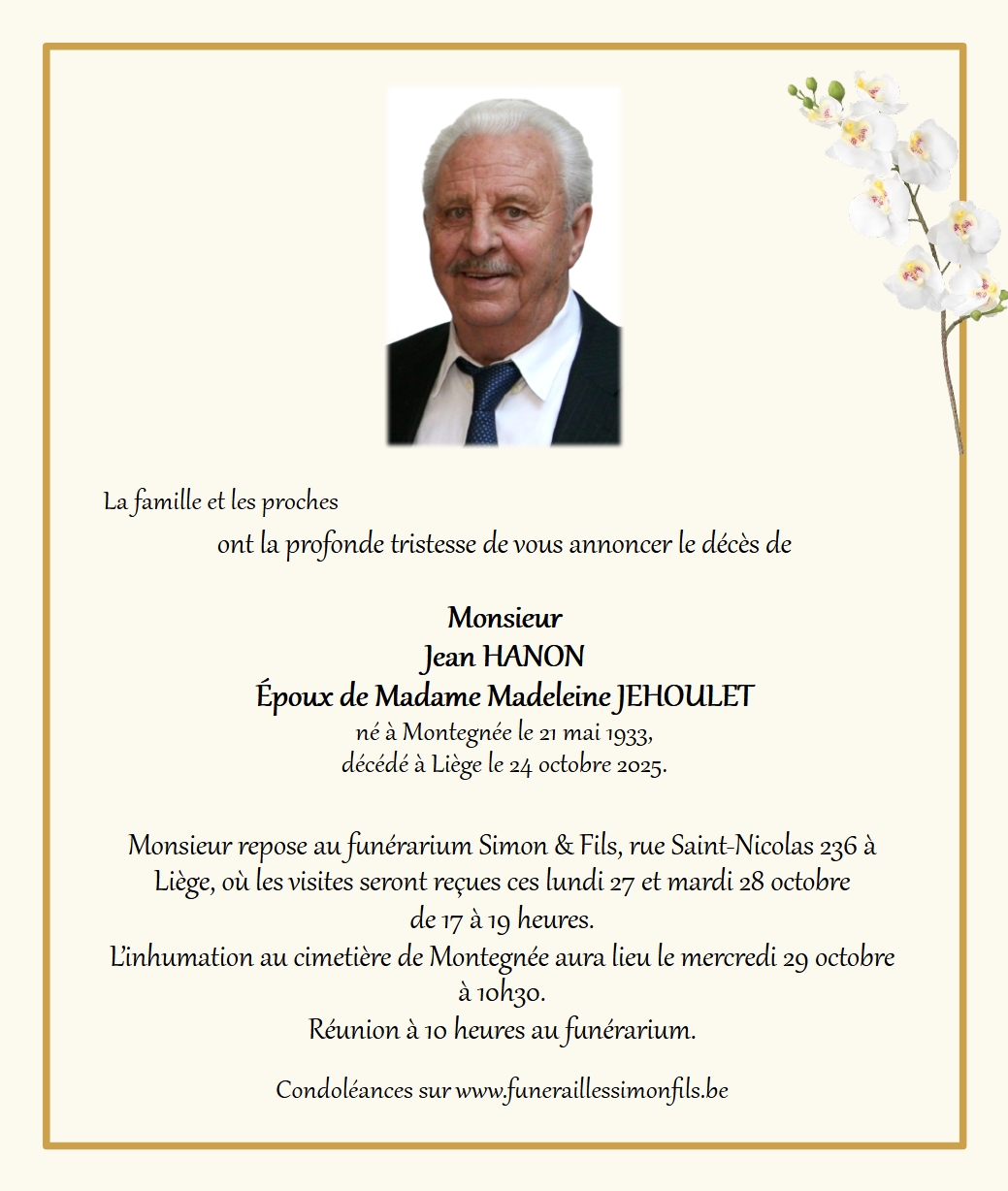 Décédé à Liège (4000) le vendredi 24 octobre 2025 à l'âge de 92 ans