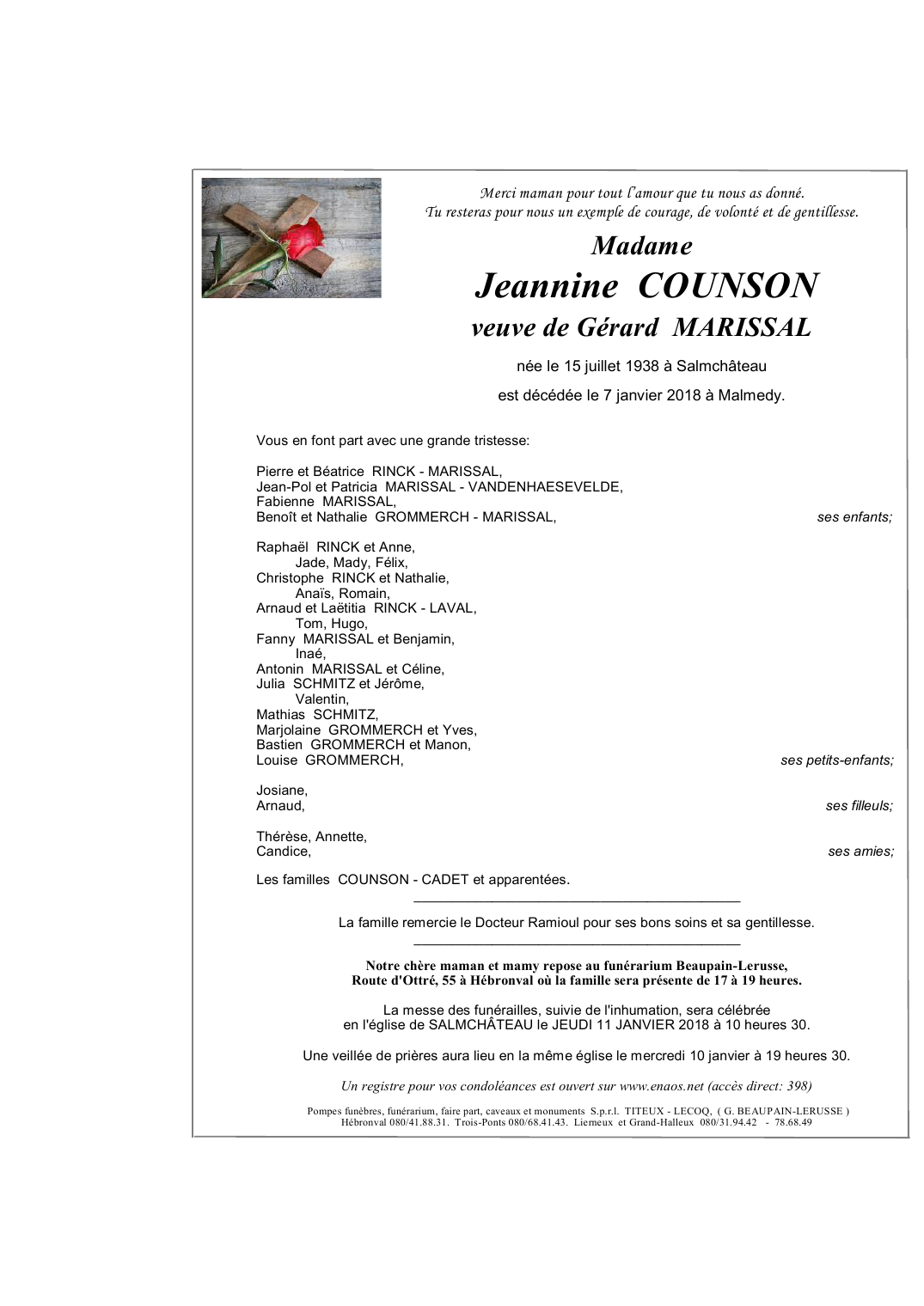 Décédée à Malmedy (4960) le dimanche 7 janvier 2018 à l'âge de 79 ans
