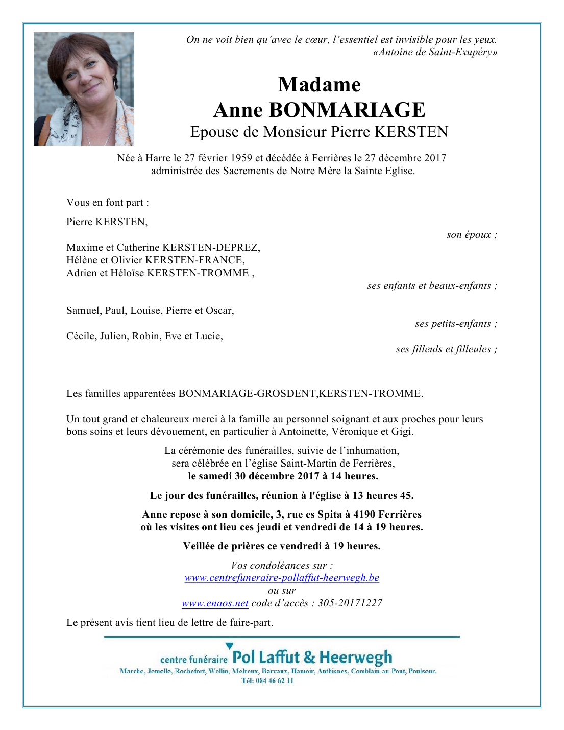 Décédée à Ferrières (4190) le mercredi 27 décembre 2017 à l'âge de 58 ans
