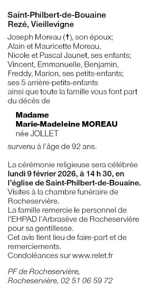 Fallecida en Rocheservière (85620, Francia) el jueves, 5 de febrero de 2026 a la edad de 92 años