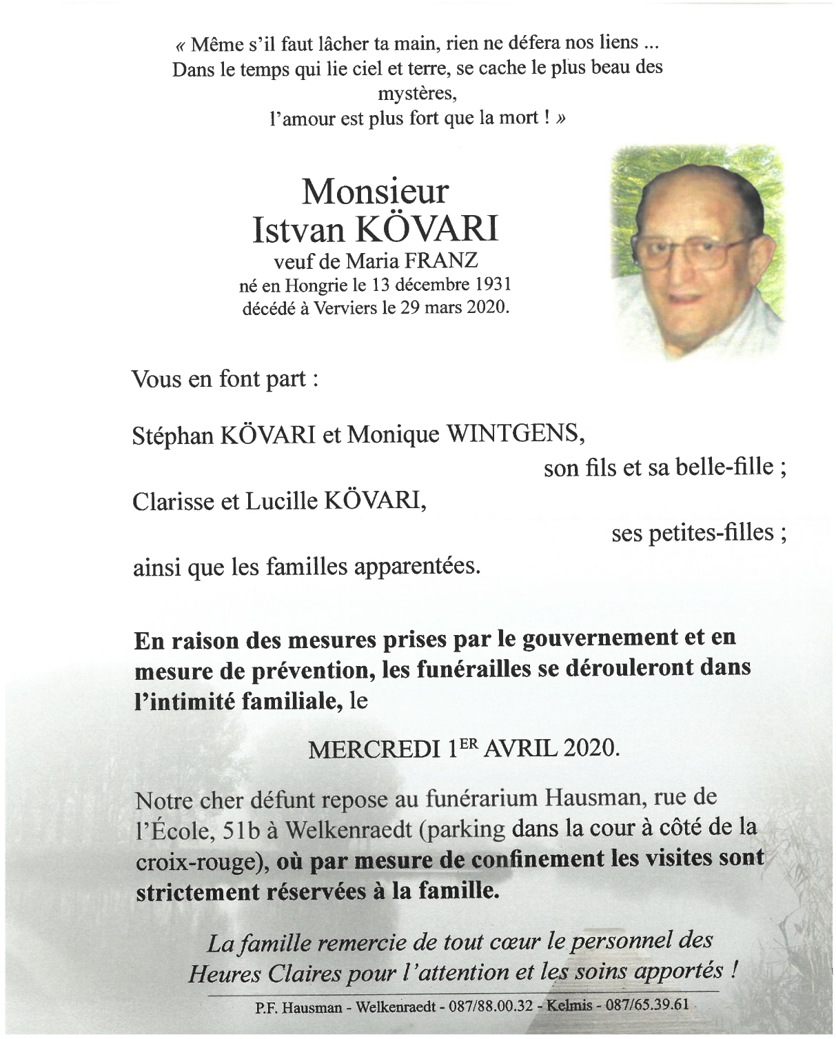 Décédé à Verviers (4800) le dimanche 29 mars 2020 à l'âge de 88 ans