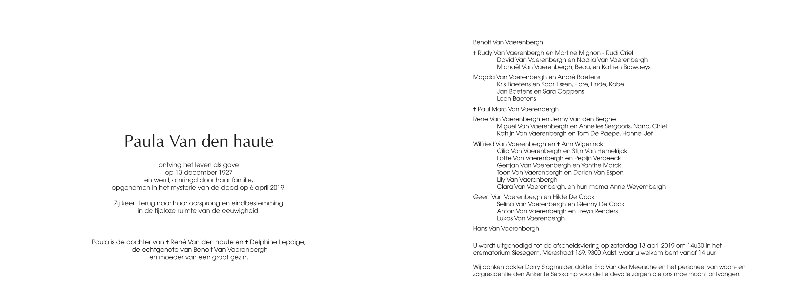 Décédée à Aalst (9300) le samedi 6 avril 2019 à l'âge de 91 ans