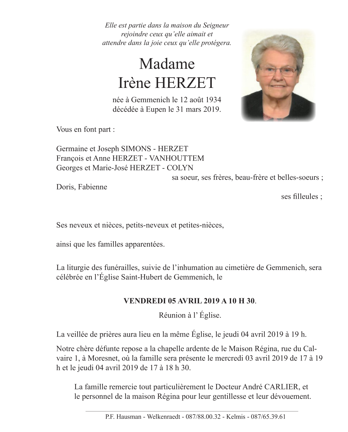 Décédée à Eupen (4700) le dimanche 31 mars 2019 à l'âge de 84 ans