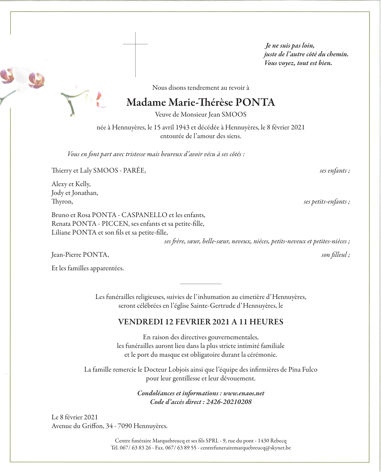 Décédée à Hennuyères (7090) le lundi 8 février 2021 à l'âge de 77 ans