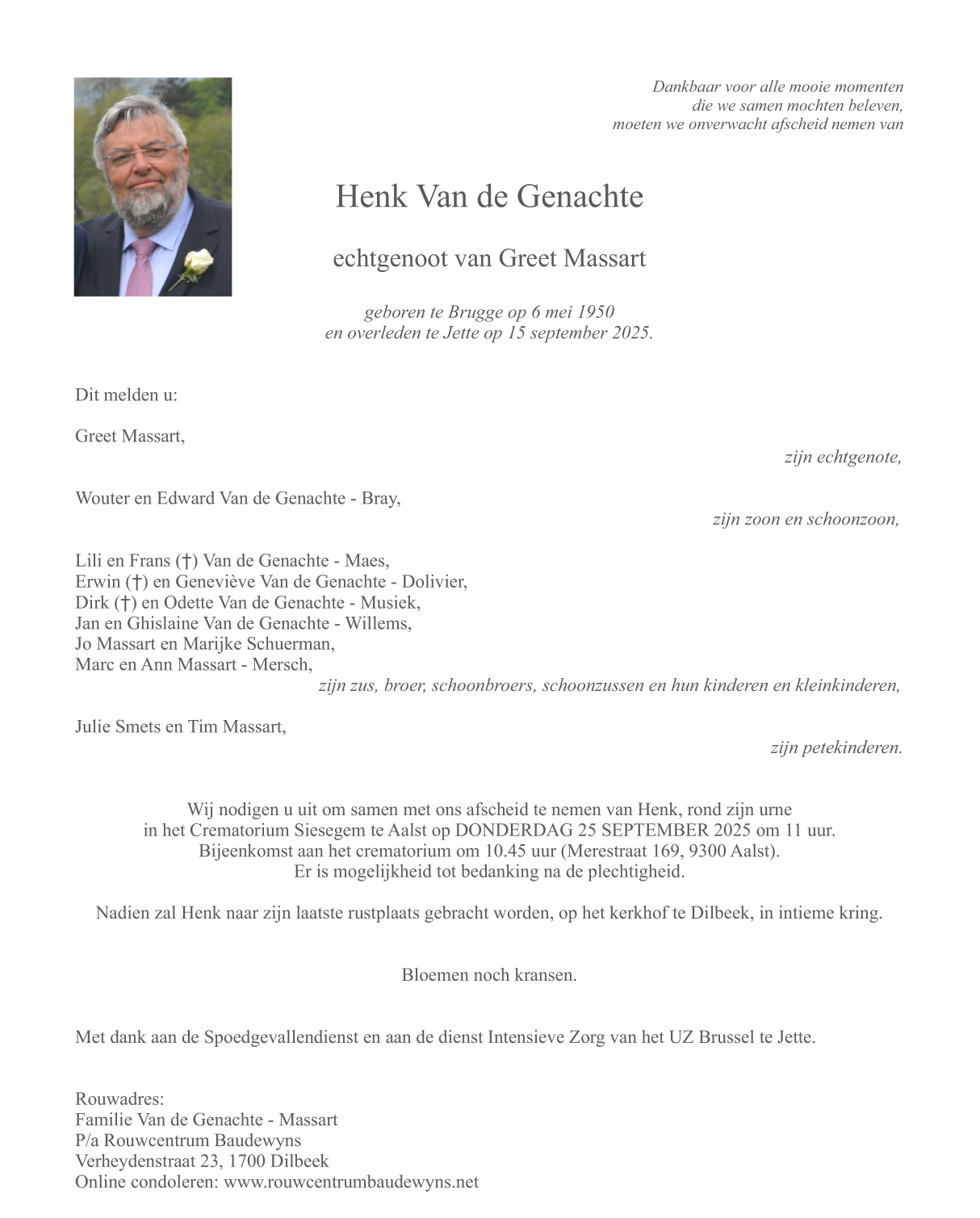 Décédé à Jette (1090) le lundi 15 septembre 2025 à l'âge de 75 ans