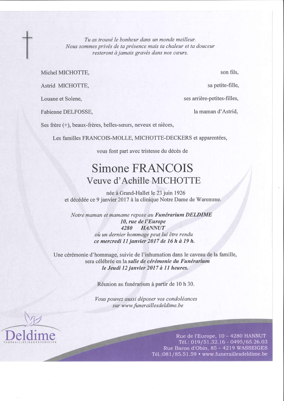 Weduwe van Monsieur Achille MICHOTTE