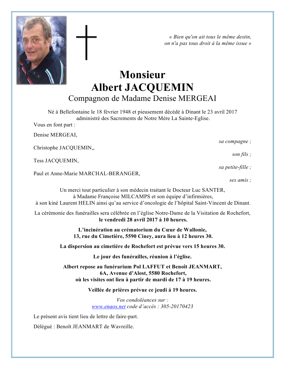 Décédé à Dinant (5500) le dimanche 23 avril 2017 à l'âge de 69 ans