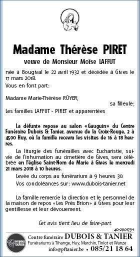 Décédée à Huy (4500) le samedi 17 mars 2018 à l'âge de 85 ans