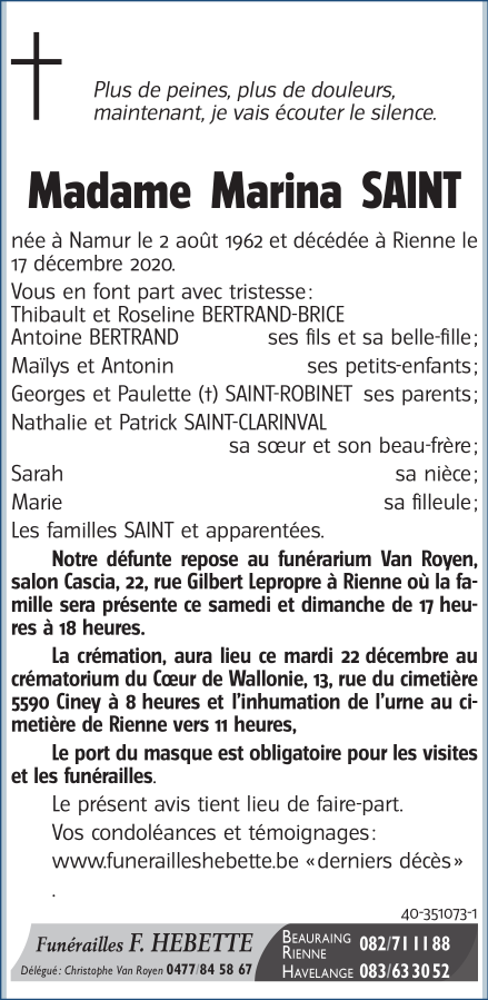 Fallecida en Rienne (5575) el jueves, 17 de diciembre de 2020 a la edad de 58 años