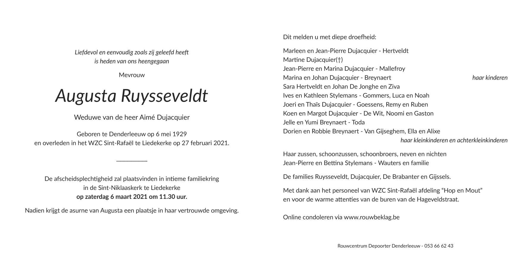 Fallecida en Liedekerke (1770) el sábado, 27 de febrero de 2021 a la edad de 91 años