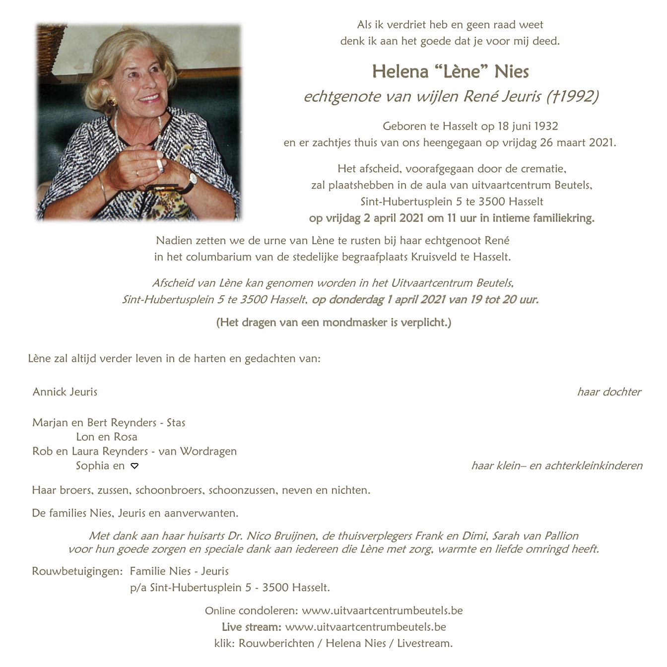 Décédée à Hasselt (3500) le vendredi 26 mars 2021 à l'âge de 88 ans