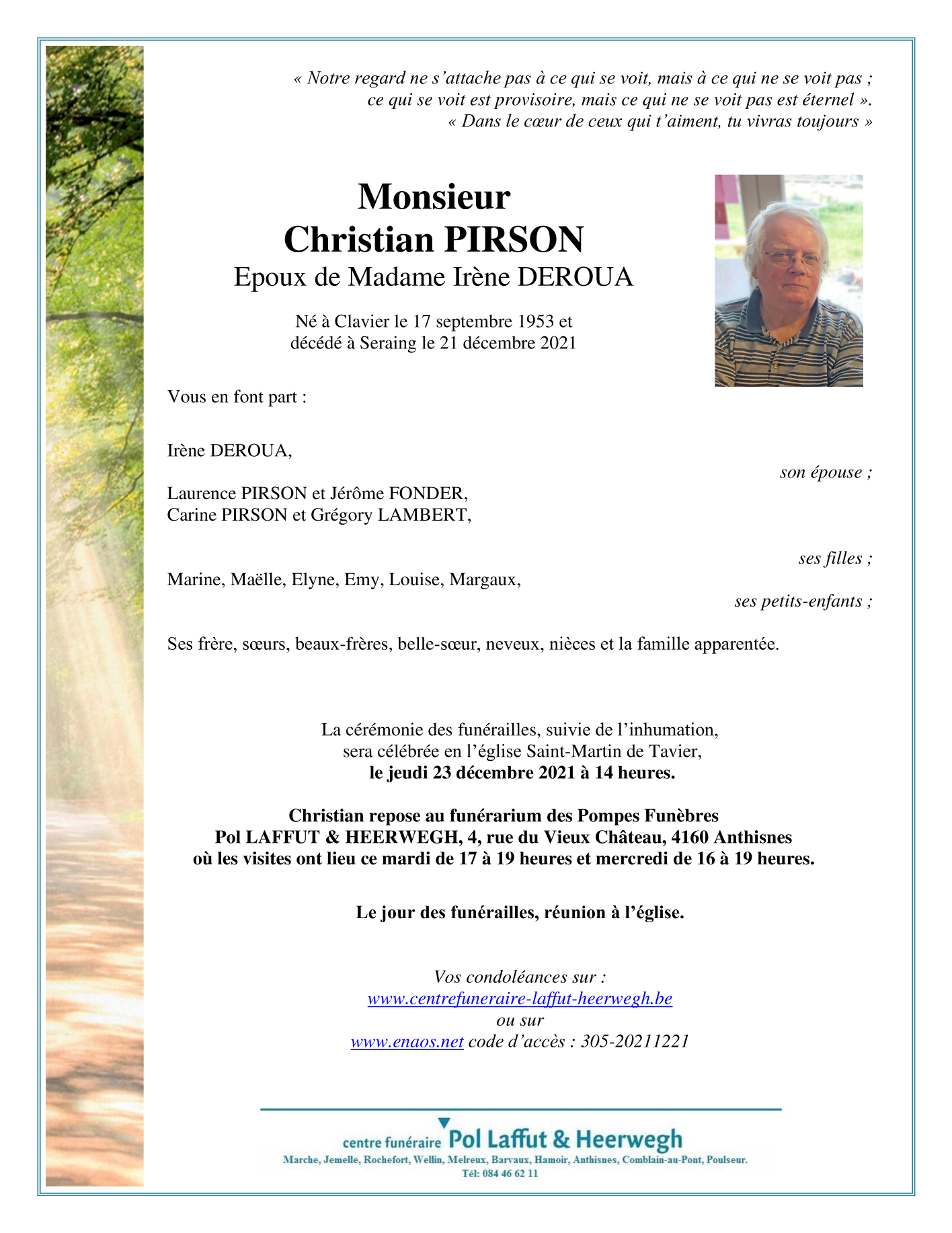 Décédé à Seraing (4100) le mardi 21 décembre 2021 à l'âge de 68 ans