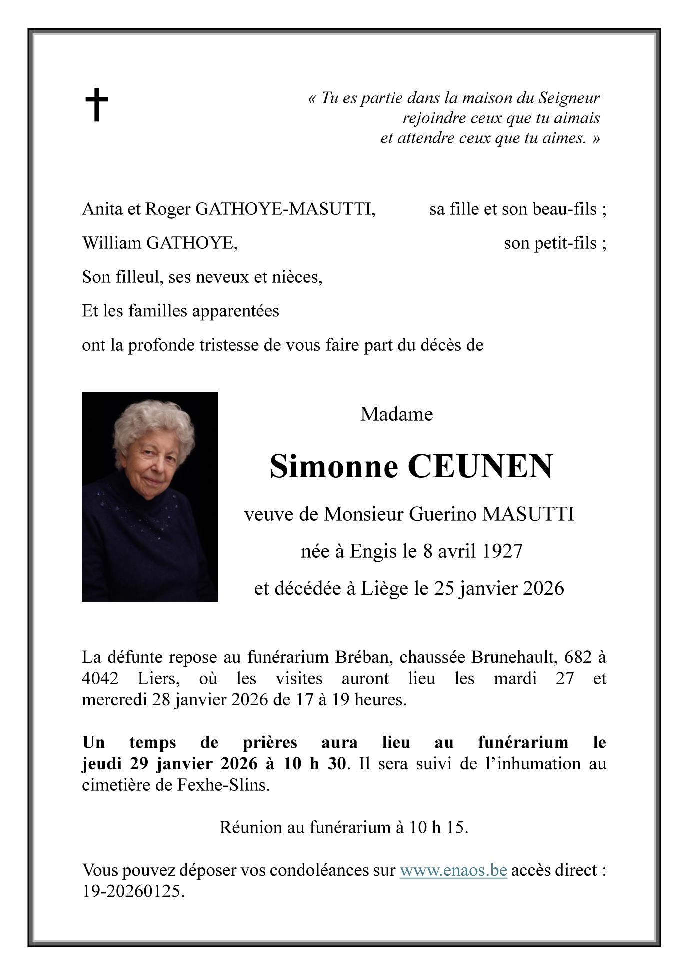 Madame Simonne CEUNEN veuve de Guerino MASUTTI