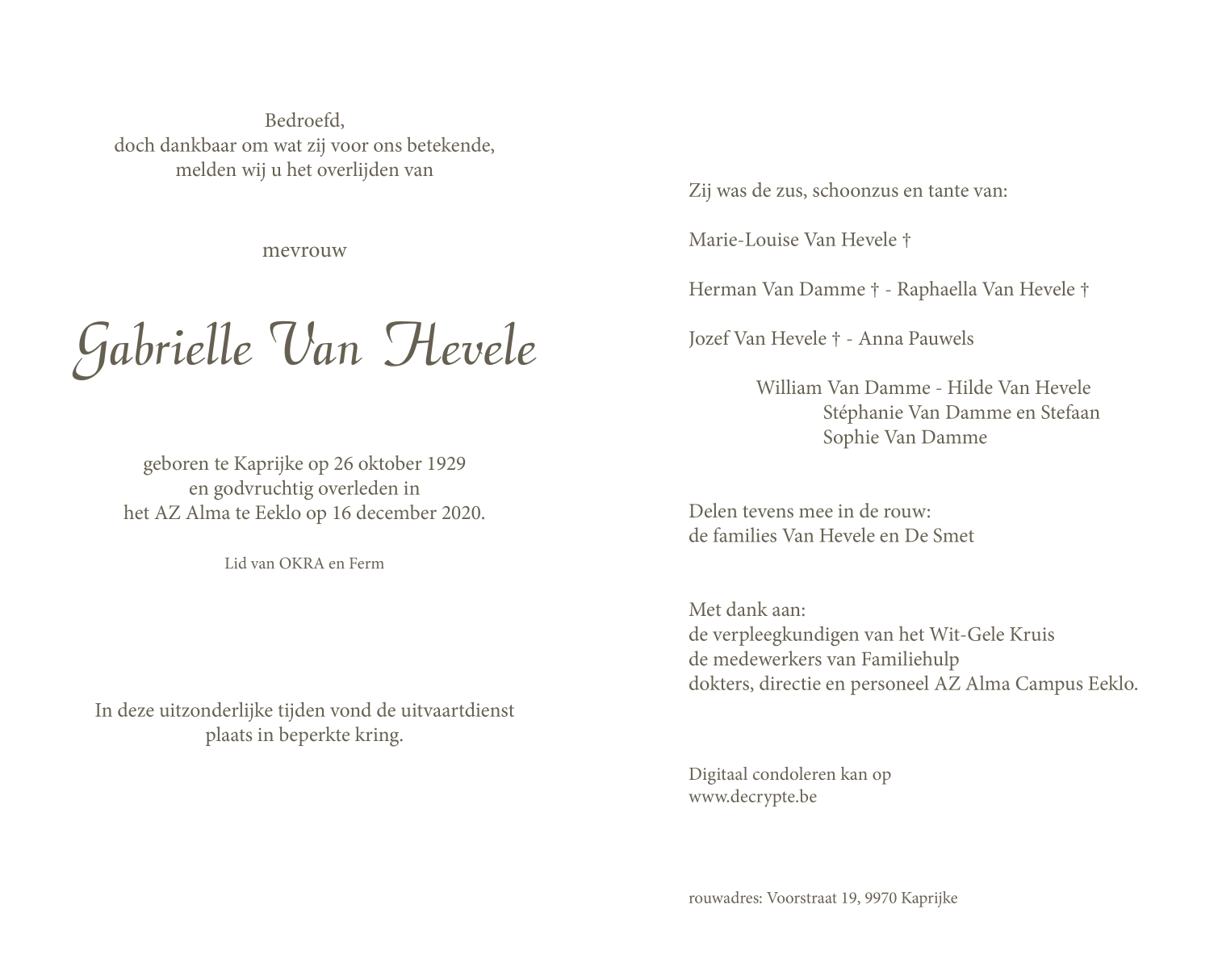 Mevrouw Gabrielle Van Hevele