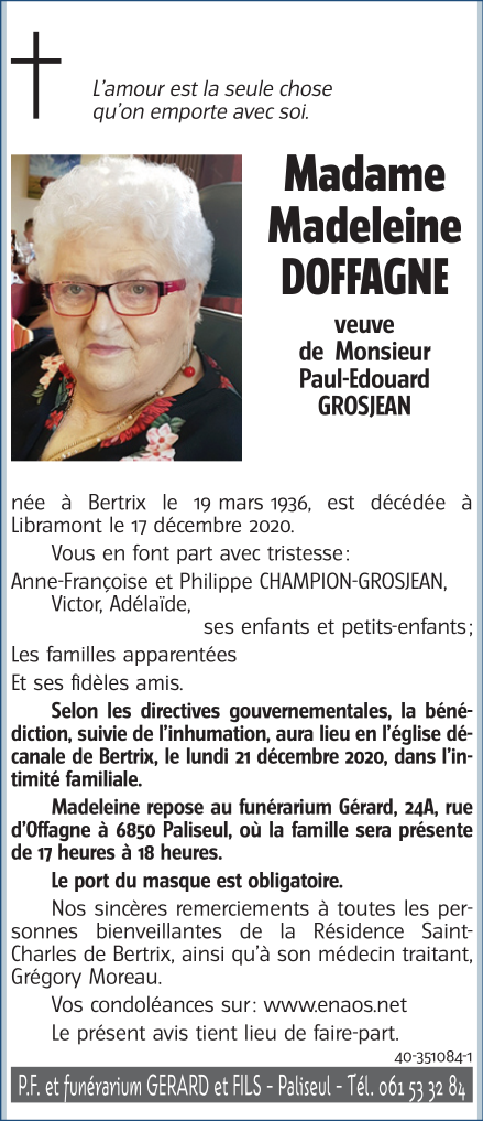 Fallecida en Libramont (6800) el jueves, 17 de diciembre de 2020 a la edad de 84 años