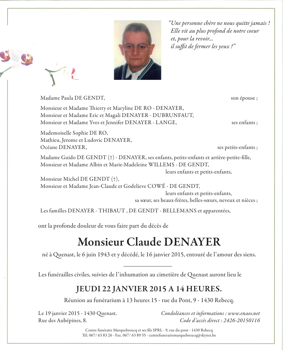 Décédé à Quenast (1430) le vendredi 16 janvier 2015 à l'âge de 71 ans