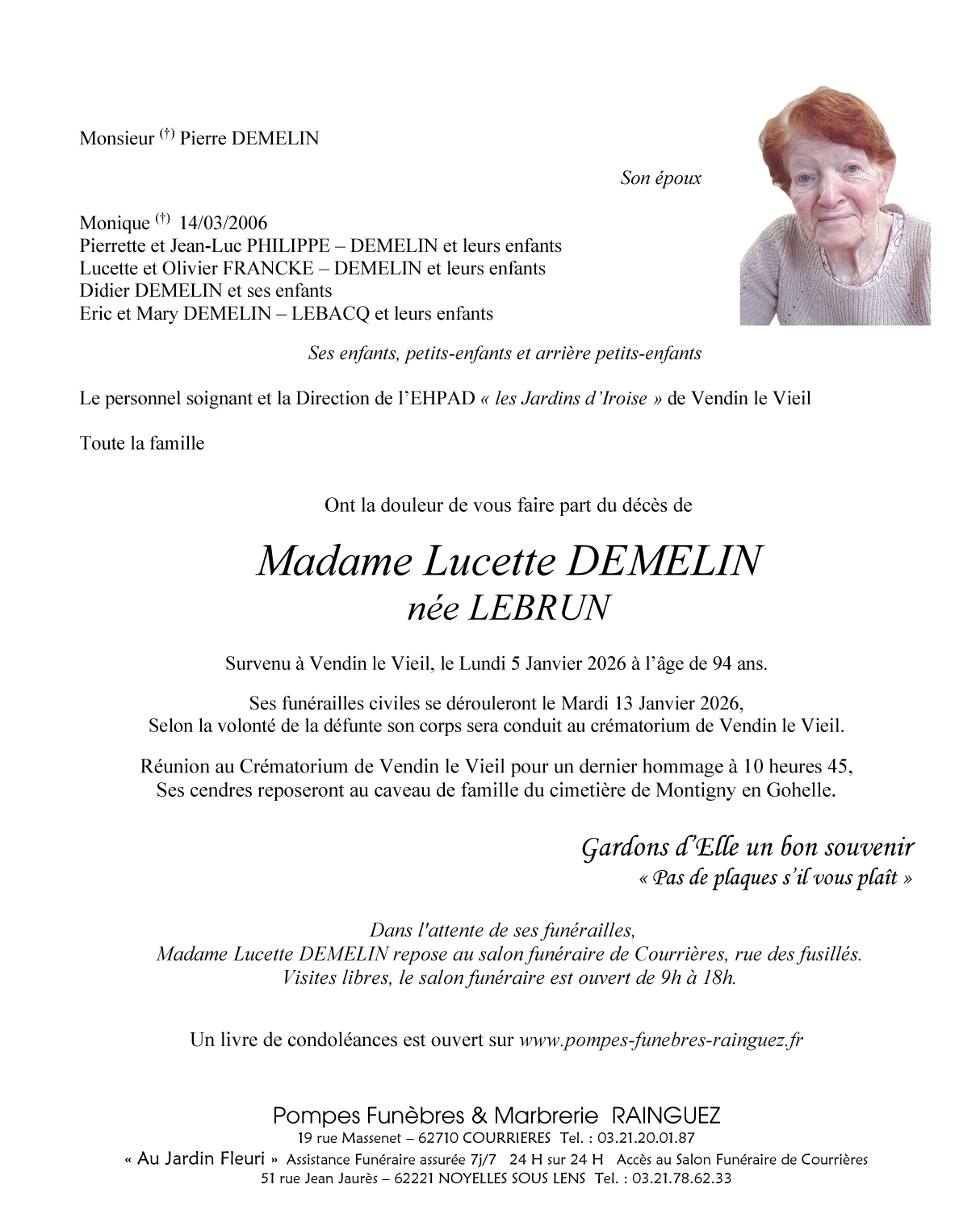 Décédée à Vendin-le-Vieil (62880, France) le lundi 5 janvier 2026 à l'âge de 94 ans