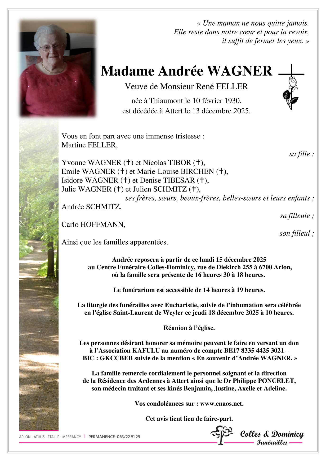 Fallecida en Attert (6717) el sábado, 13 de diciembre de 2025 a la edad de 95 años