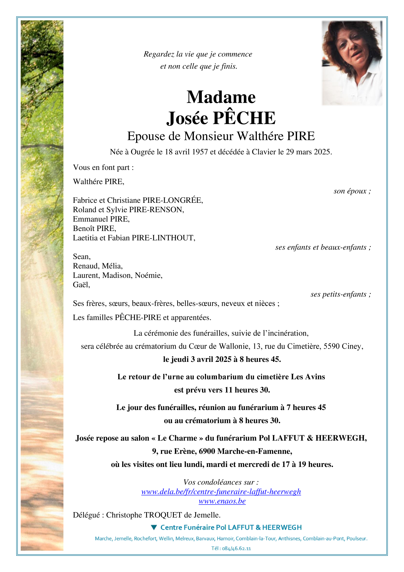 Décédée à Clavier (4560) le samedi 29 mars 2025 à l'âge de 67 ans