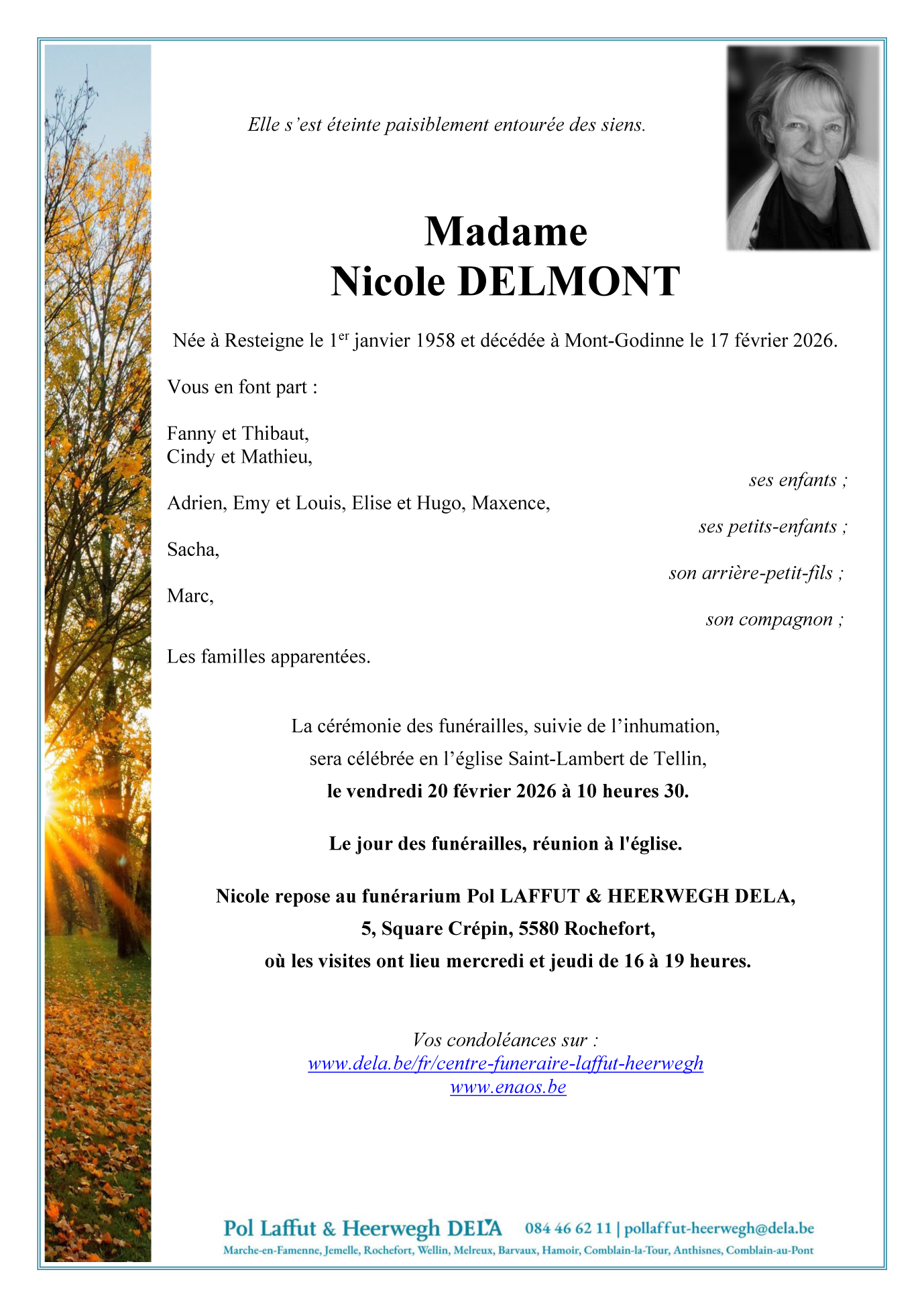 Décédée à Mont-Godinne (5530) le mardi 17 février 2026 à l'âge de 68 ans