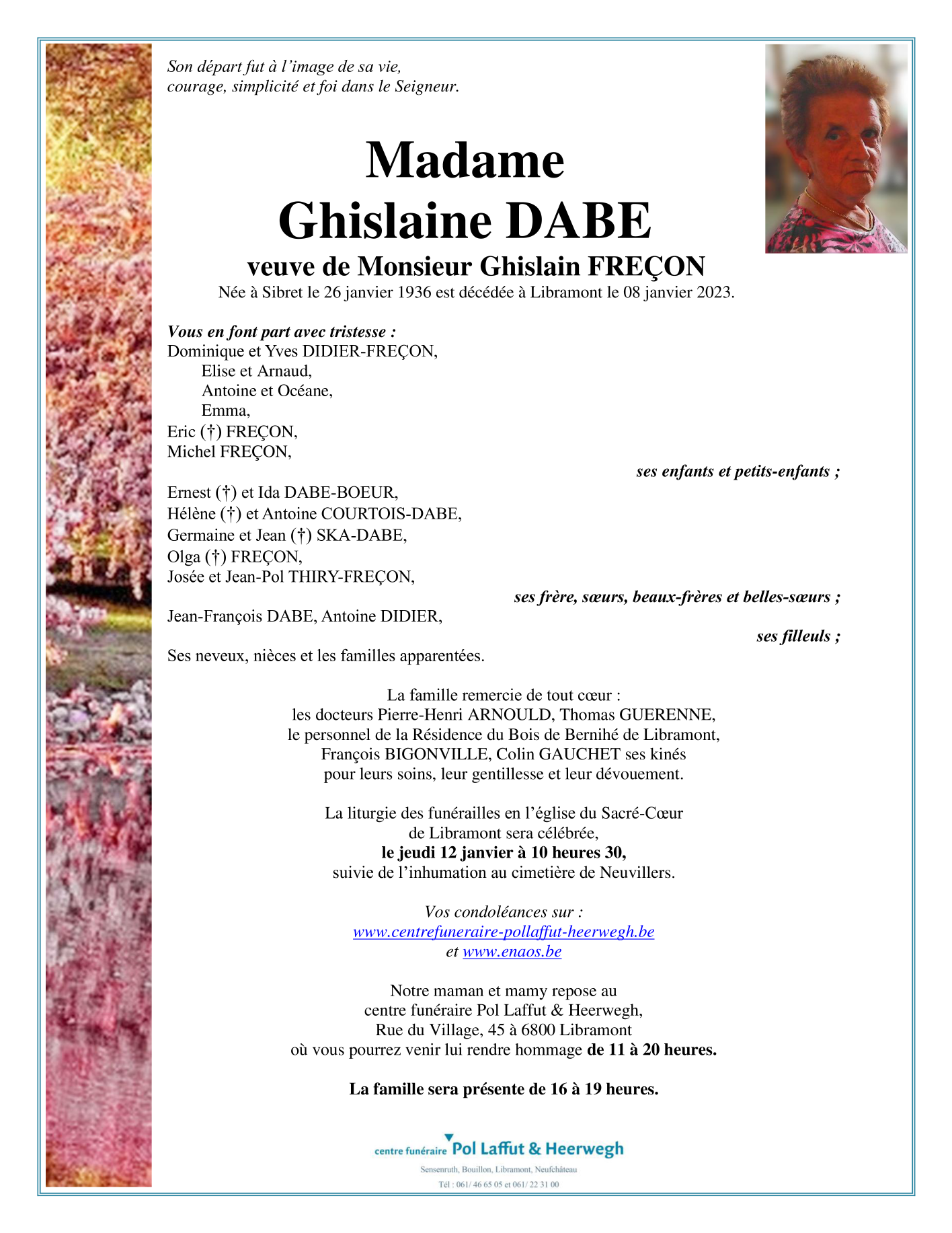 Décédée à Libramont-Chevigny (6800) le dimanche 8 janvier 2023 à l'âge de 86 ans