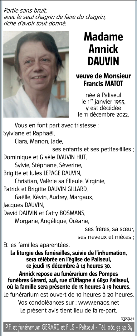 Décédée à Paliseul (6850) le lundi 12 décembre 2022 à l'âge de 67 ans