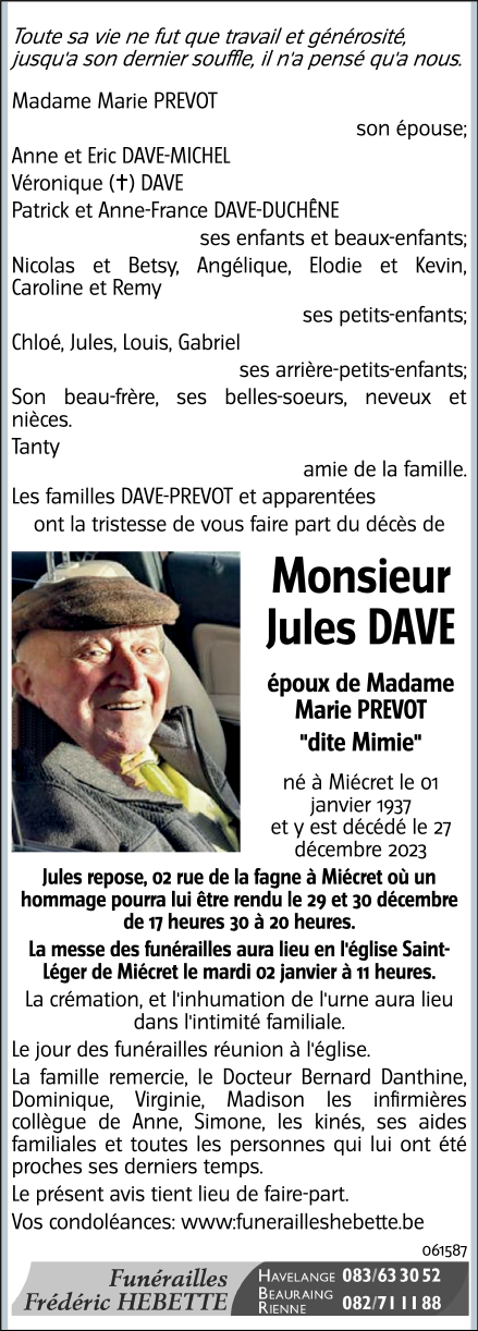 Died in Miécret (5376) on 27 December 2023 at the age of 86 years