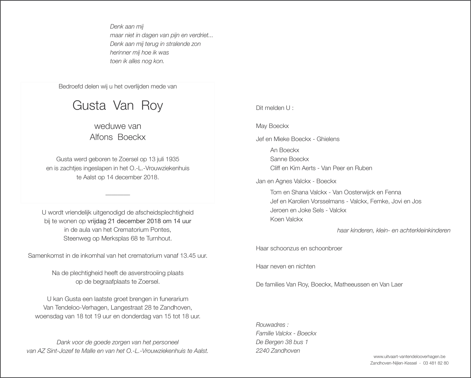 Décédée à Aalst (9300) le vendredi 14 décembre 2018 à l'âge de 83 ans