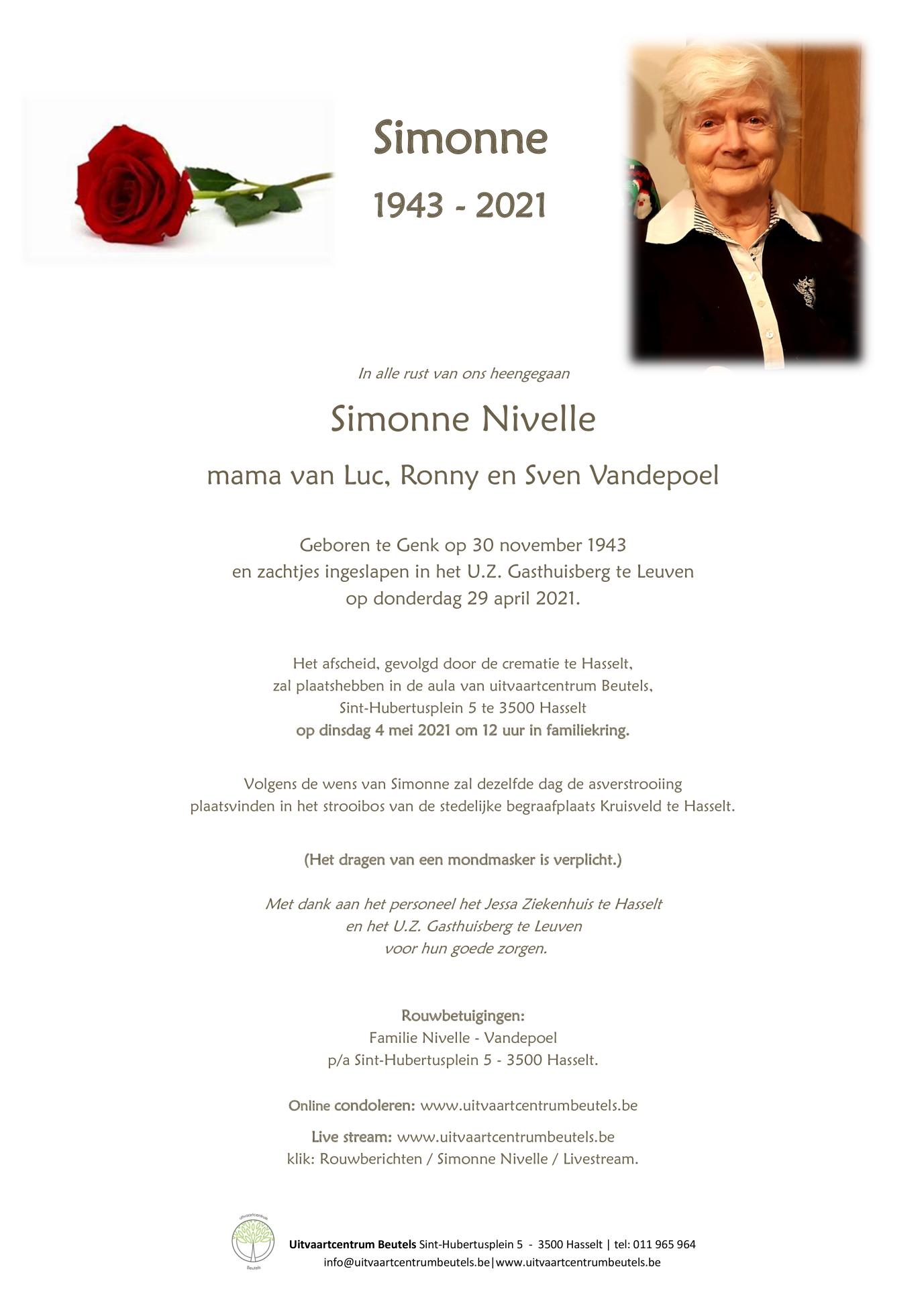 Décédée à Leuven (3000) le jeudi 29 avril 2021 à l'âge de 77 ans