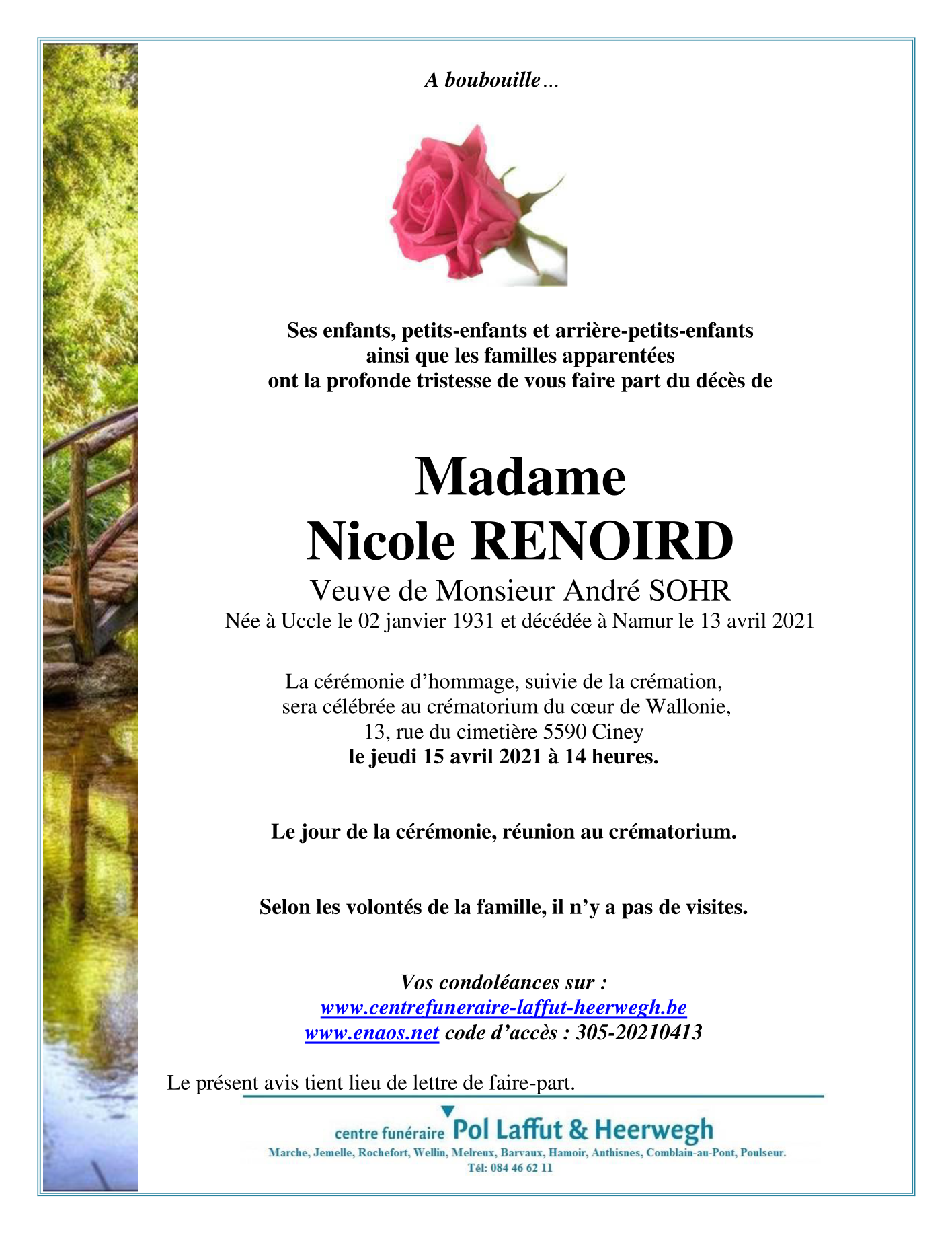 Décédée à Namur (5000) le mardi 13 avril 2021 à l'âge de 90 ans