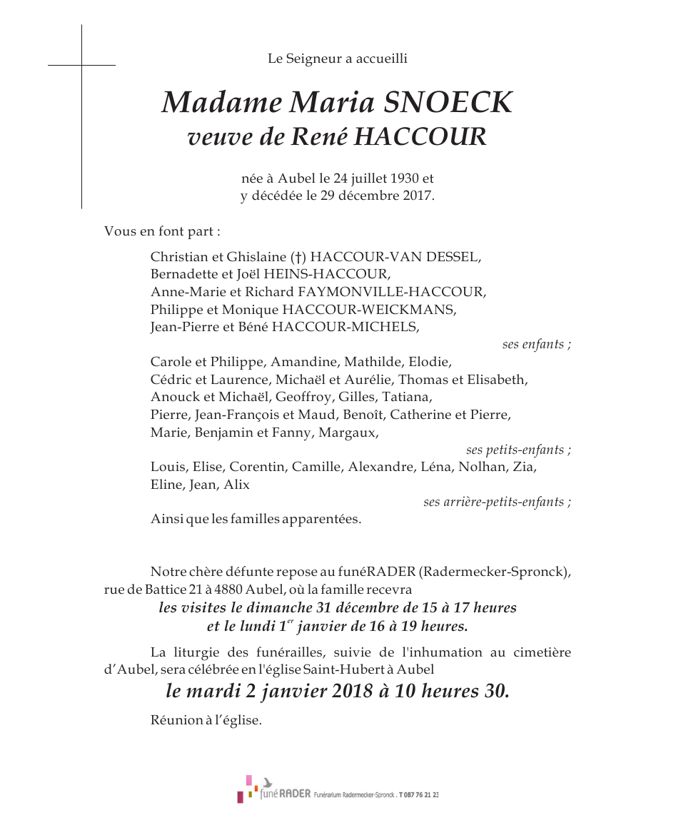 Décédée à Aubel (4880) le vendredi 29 décembre 2017 à l'âge de 87 ans