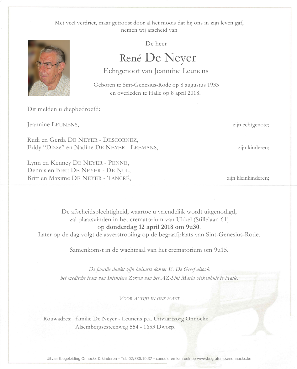 Décédé à Halle (1500) le dimanche 8 avril 2018 à l'âge de 84 ans