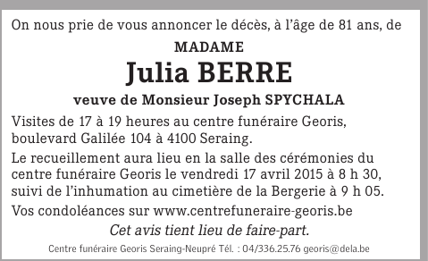 Fallecida en Seraing (4100) el lunes, 13 de abril de 2015 a la edad de 81 años
