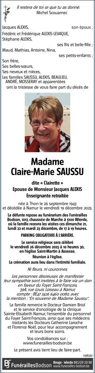 Décédée à Namur (5000) le vendredi 19 décembre 2025 à l'âge de 82 ans