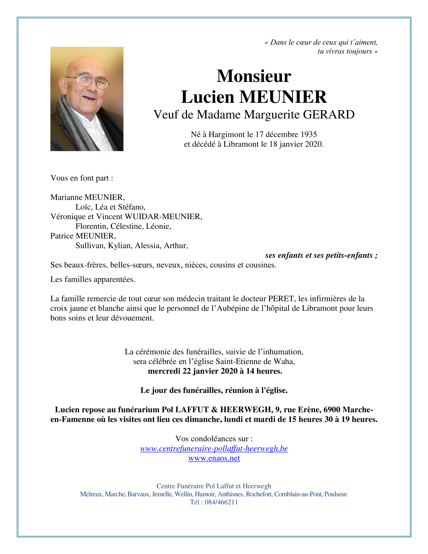 Died in Libramont (6800) on 18 January 2020 at the age of 84 years