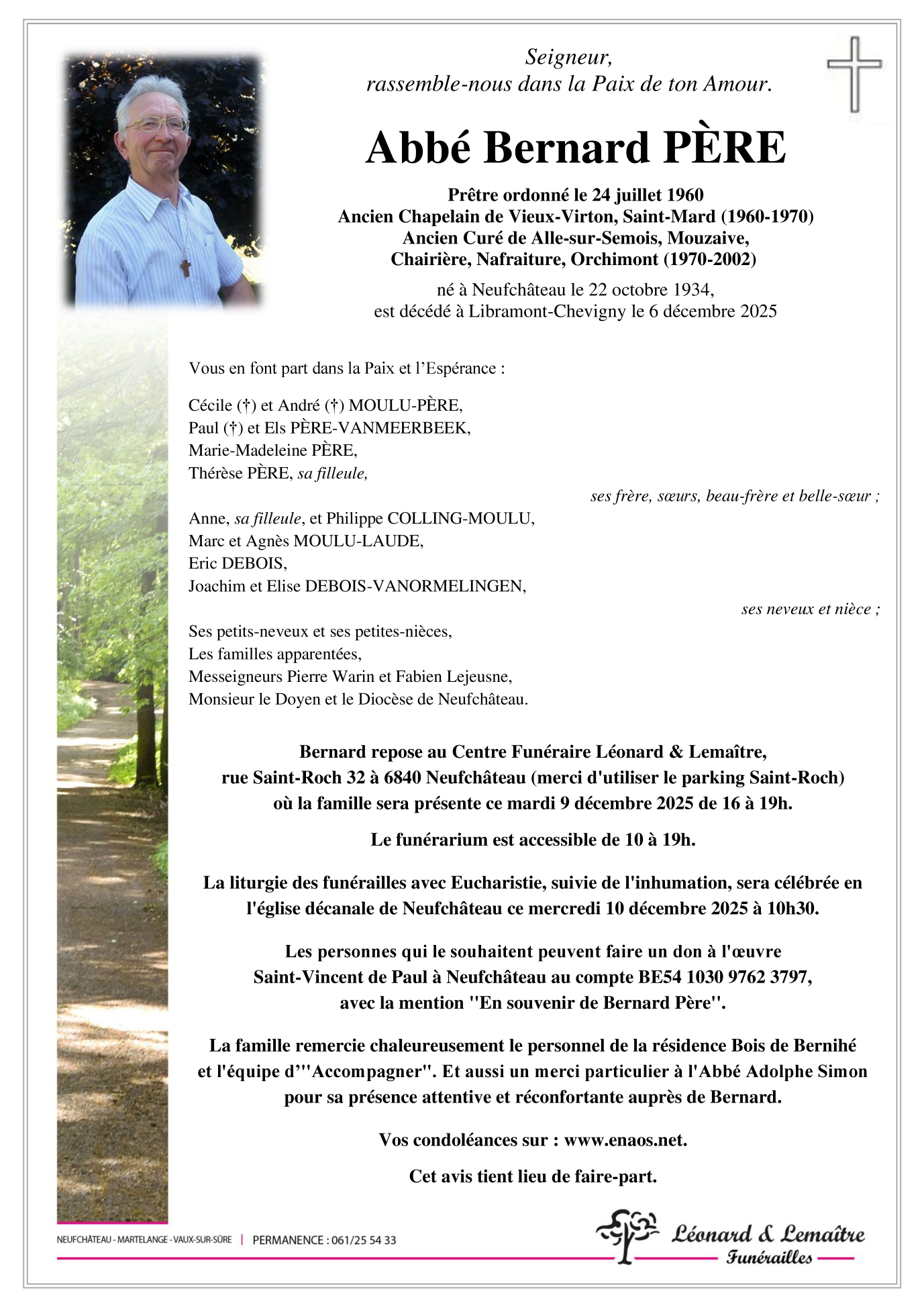 Décédé à Libramont-Chevigny (6800) le samedi 6 décembre 2025 à l'âge de 91 ans