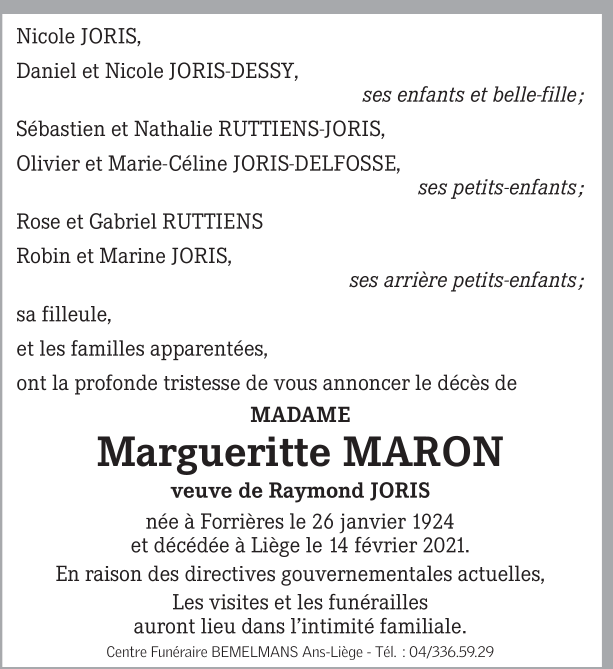 Fallecida en Liège (4020) el domingo, 14 de febrero de 2021 a la edad de 97 años