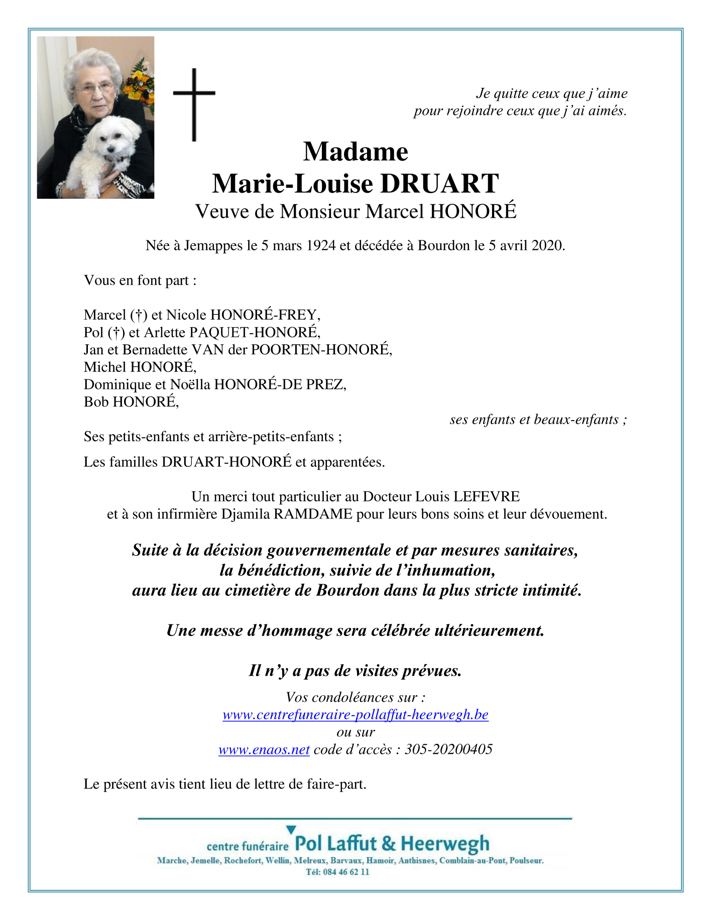 Décédée à Bourdon (6990) le dimanche 5 avril 2020 à l'âge de 96 ans