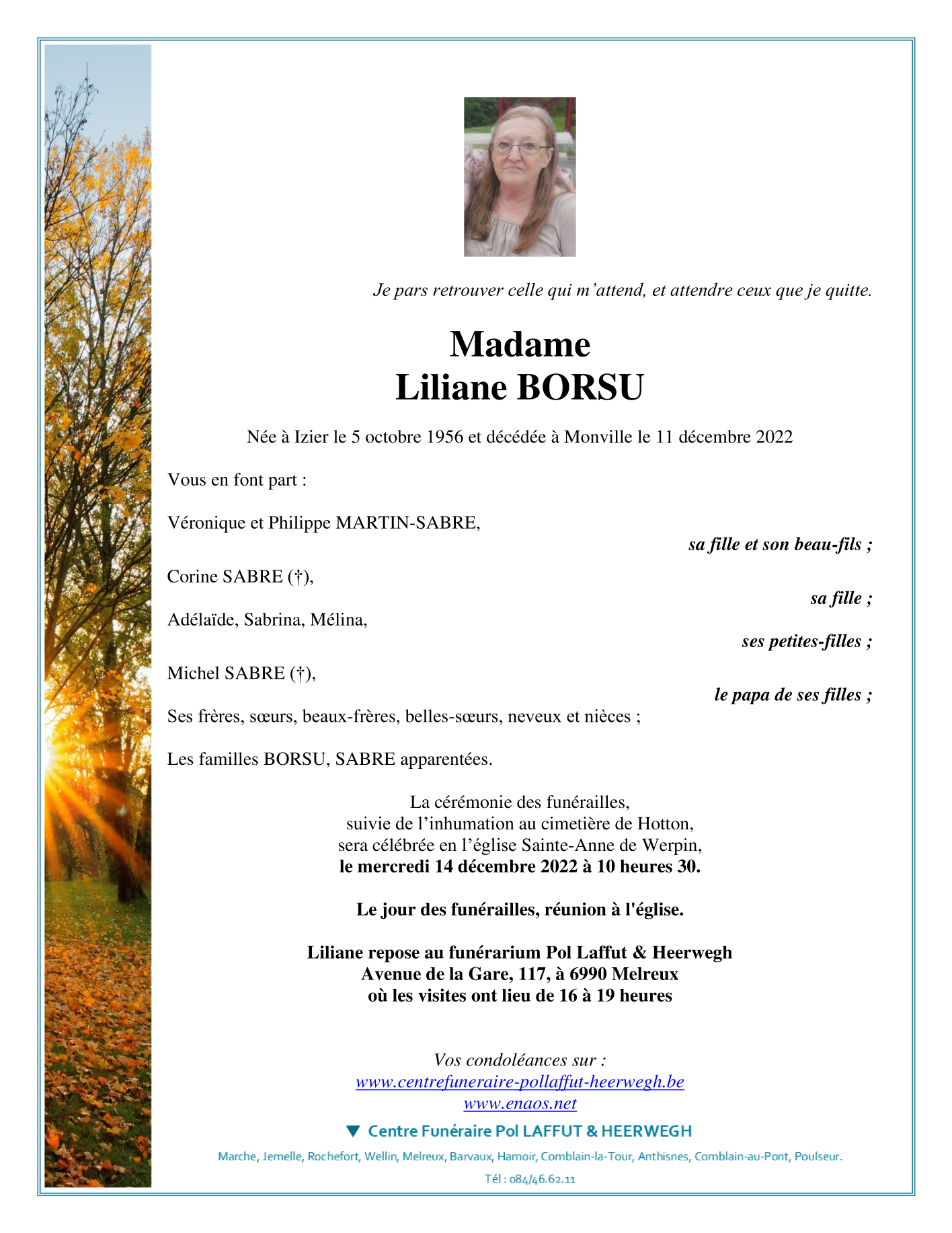 Fallecida en Monville (6990) el domingo, 11 de diciembre de 2022 a la edad de 65 años