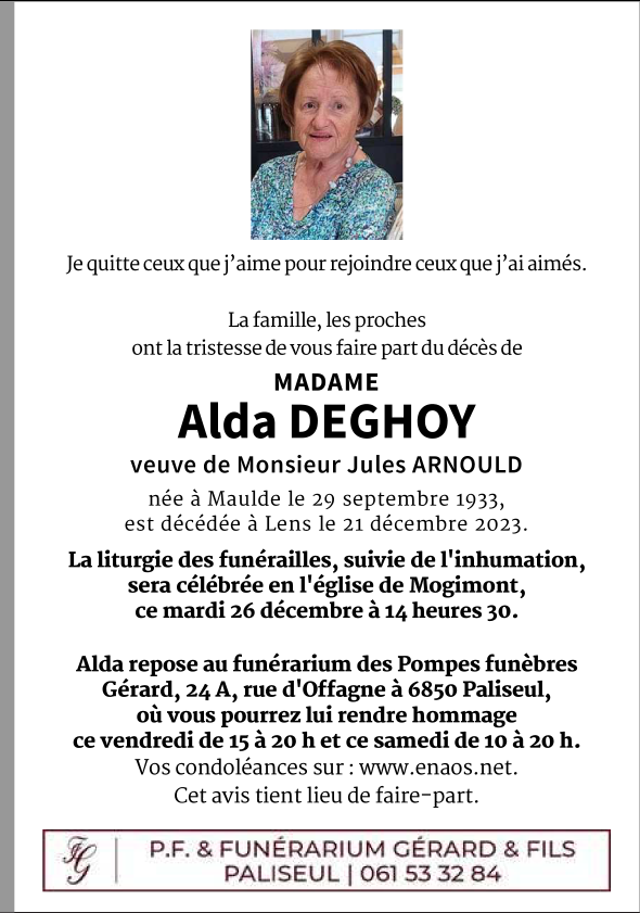 Fallecida en Lens (7870) el viernes, 22 de diciembre de 2023 a la edad de 90 años