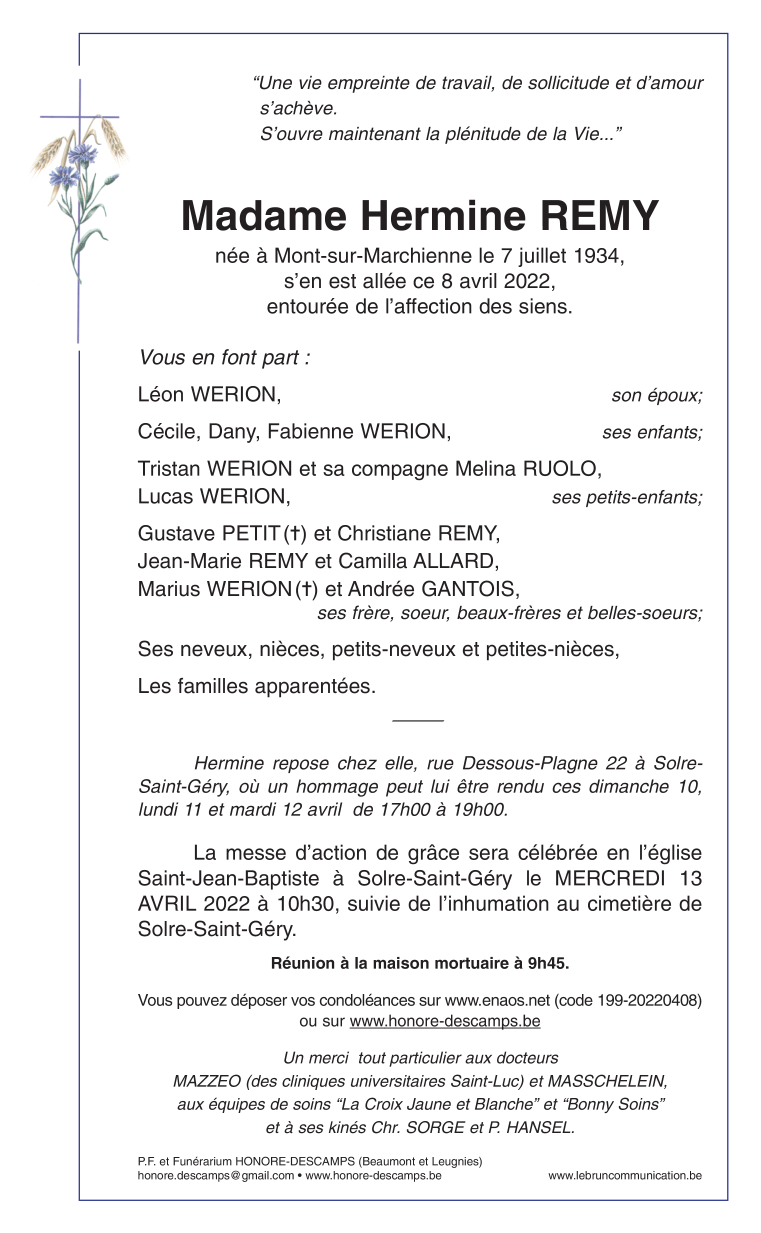 Décédée à Solre-Saint-Géry (6500) le vendredi 8 avril 2022 à l'âge de 87 ans
