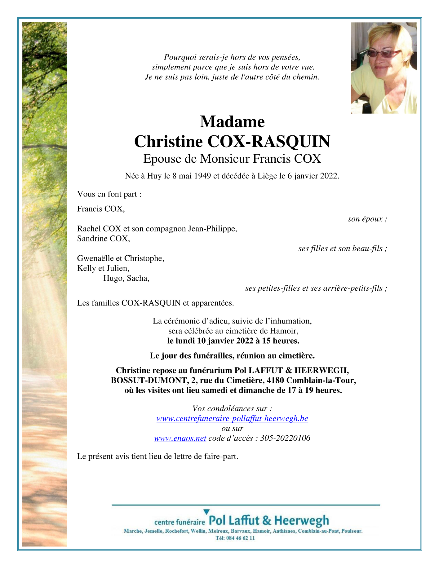 Décédée à Liège (4000) le jeudi 6 janvier 2022 à l'âge de 72 ans