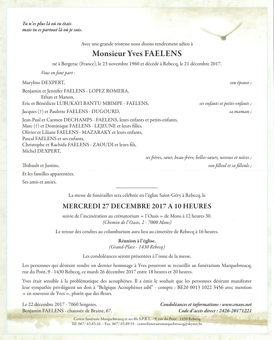 Décédé à Rebecq (1430) le jeudi 21 décembre 2017 à l'âge de 56 ans