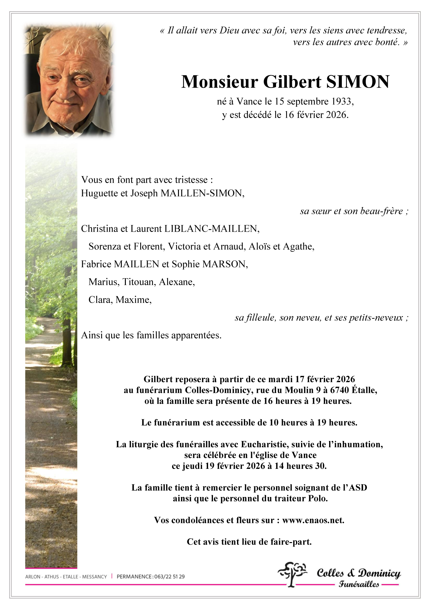 Décédé à Vance (6741) le lundi 16 février 2026 à l'âge de 92 ans