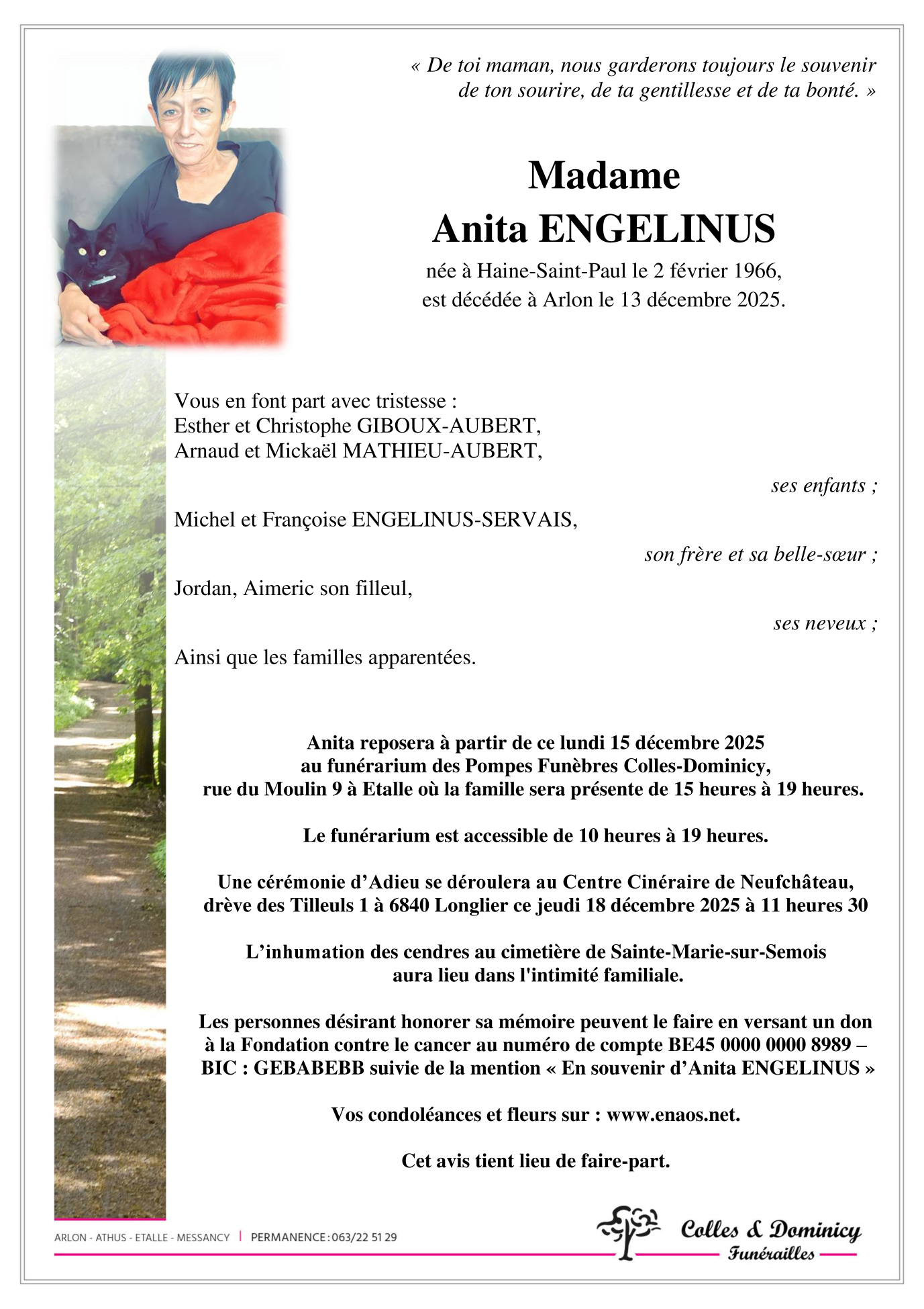 Décédée à Arlon (6700) le samedi 13 décembre 2025 à l'âge de 59 ans