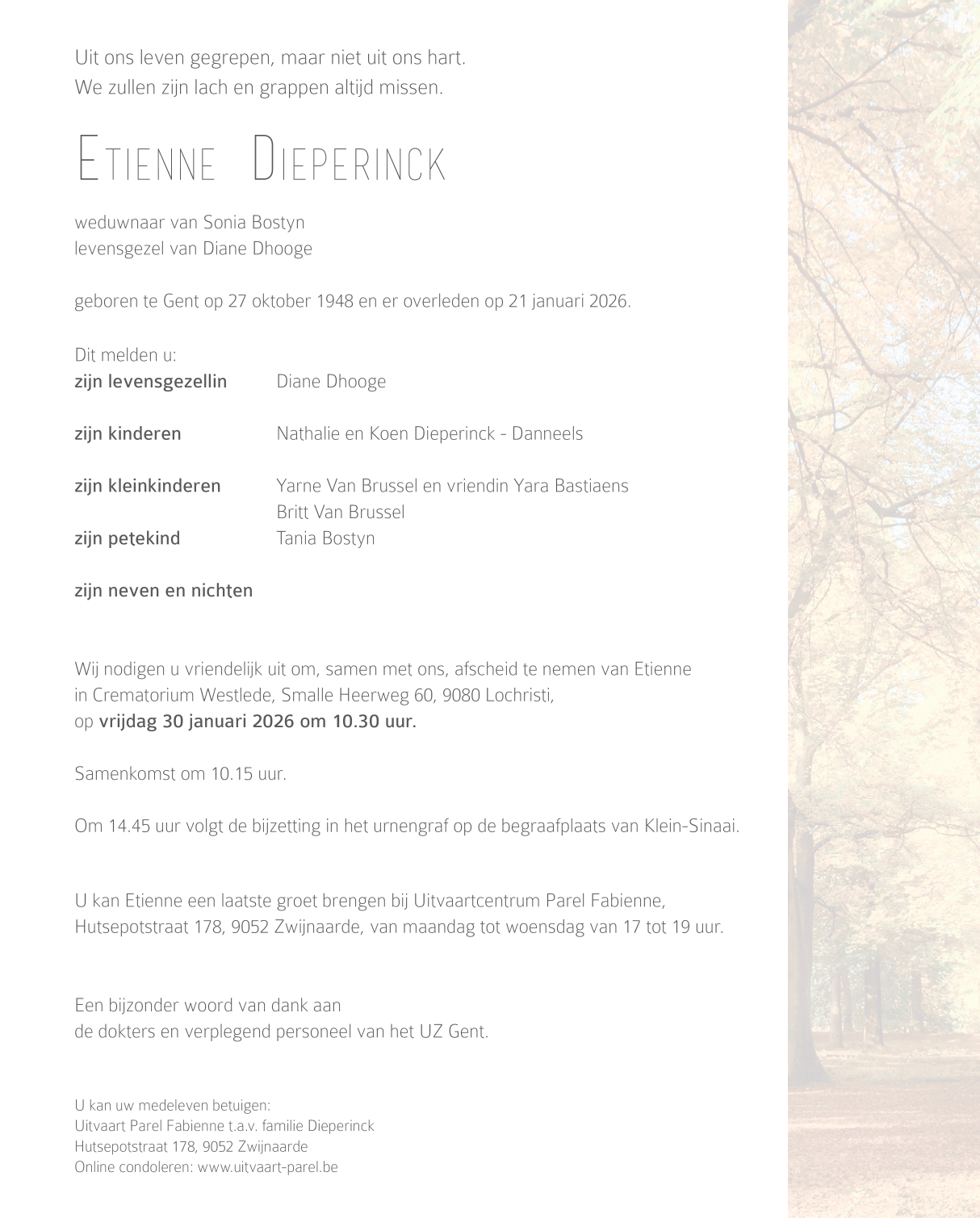 Décédé à Gent (9000) le mercredi 21 janvier 2026 à l'âge de 77 ans